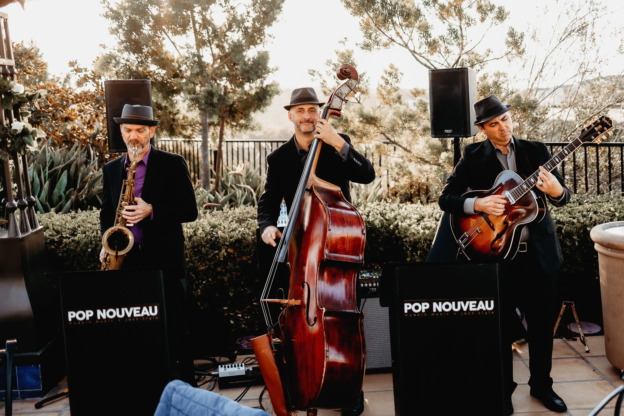 The Pop Nouveau Trio is our most popular configuration and the gold standard for creating an upscale atmosphere. It is the perfect choice for intimate gatherings where subtle volume control is paramount. By omitting drums, the Trio provides a lush, "cool" jazz sound that allows for effortless conversation while still maintaining a world-class musical presence. Whether it’s an elegant cocktail hour or a private gallery opening, the Trio offers a polished soundtrack that fits perfectly into any space.